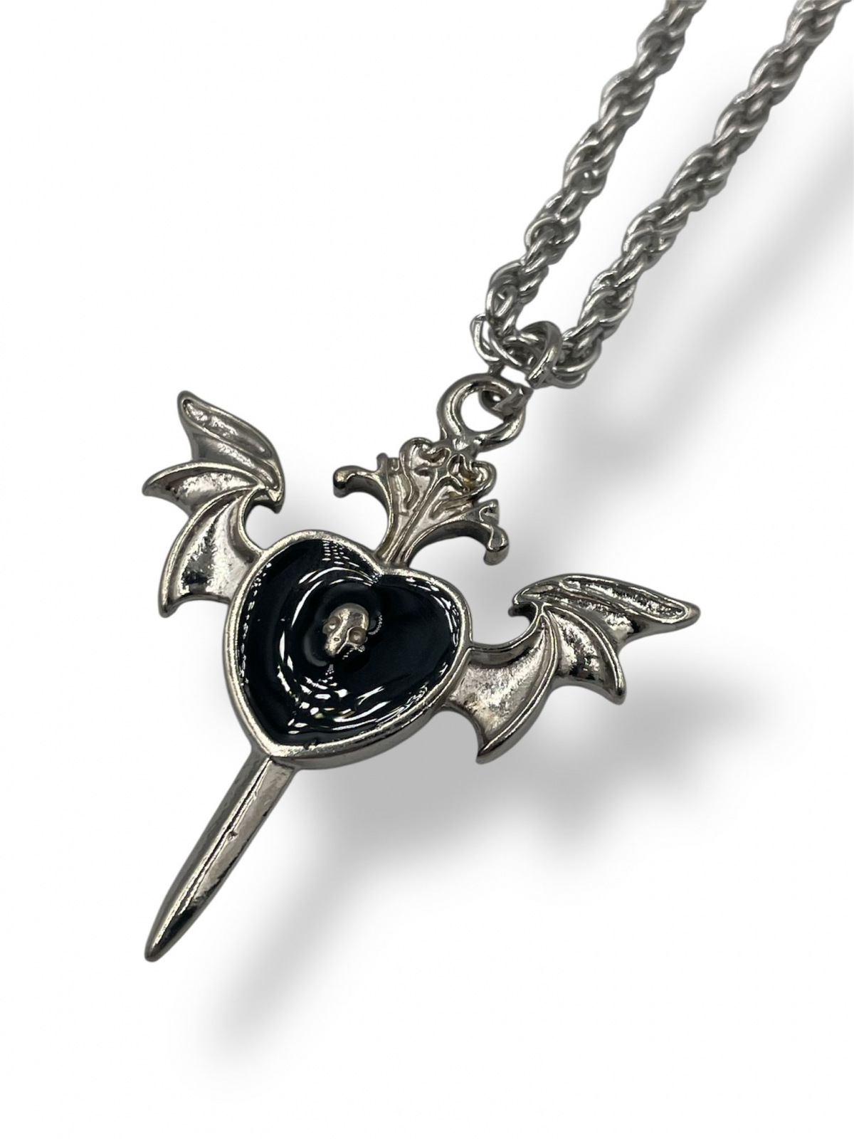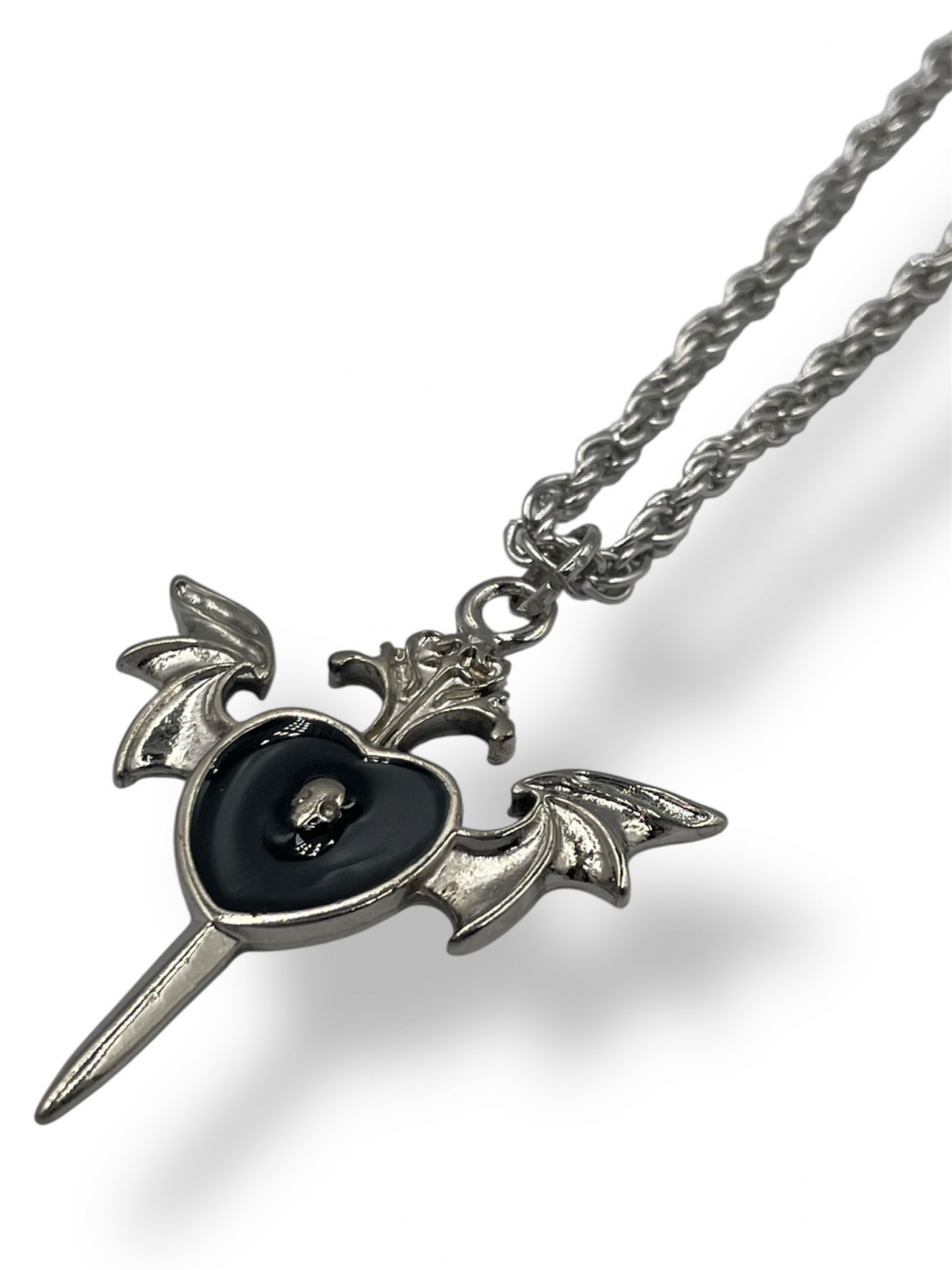 Pandantivul impresionant, de 4 x 4.5 cm, are forma unei inimi străpunse de sabie și înconjurate de aripi de dragon – un simbol al pasiunii, al luptei interioare și al puterii personale. Realizat cu atenție la detalii, acest colier adaugă un plus de stil și expresivitate look-ului tău.