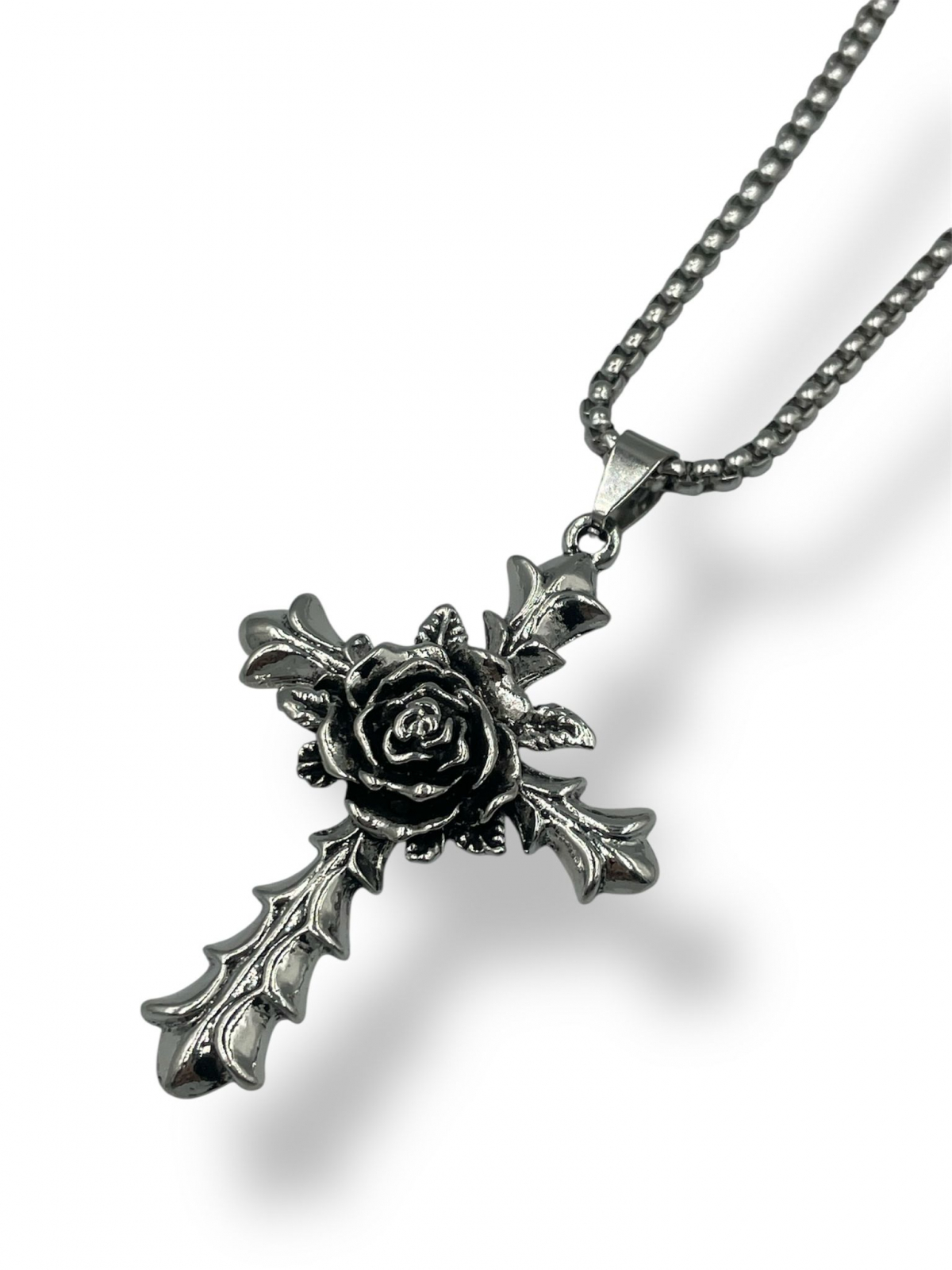 Pandantivul măsoară 4 x 5,5 cm și combină forma clasică a crucii cu delicatețea unui trandafir înflorit — un contrast armonios între forță și sensibilitate. Realizat cu detalii fine, acest colier adaugă un accent expresiv și sofisticat oricărei ținute.