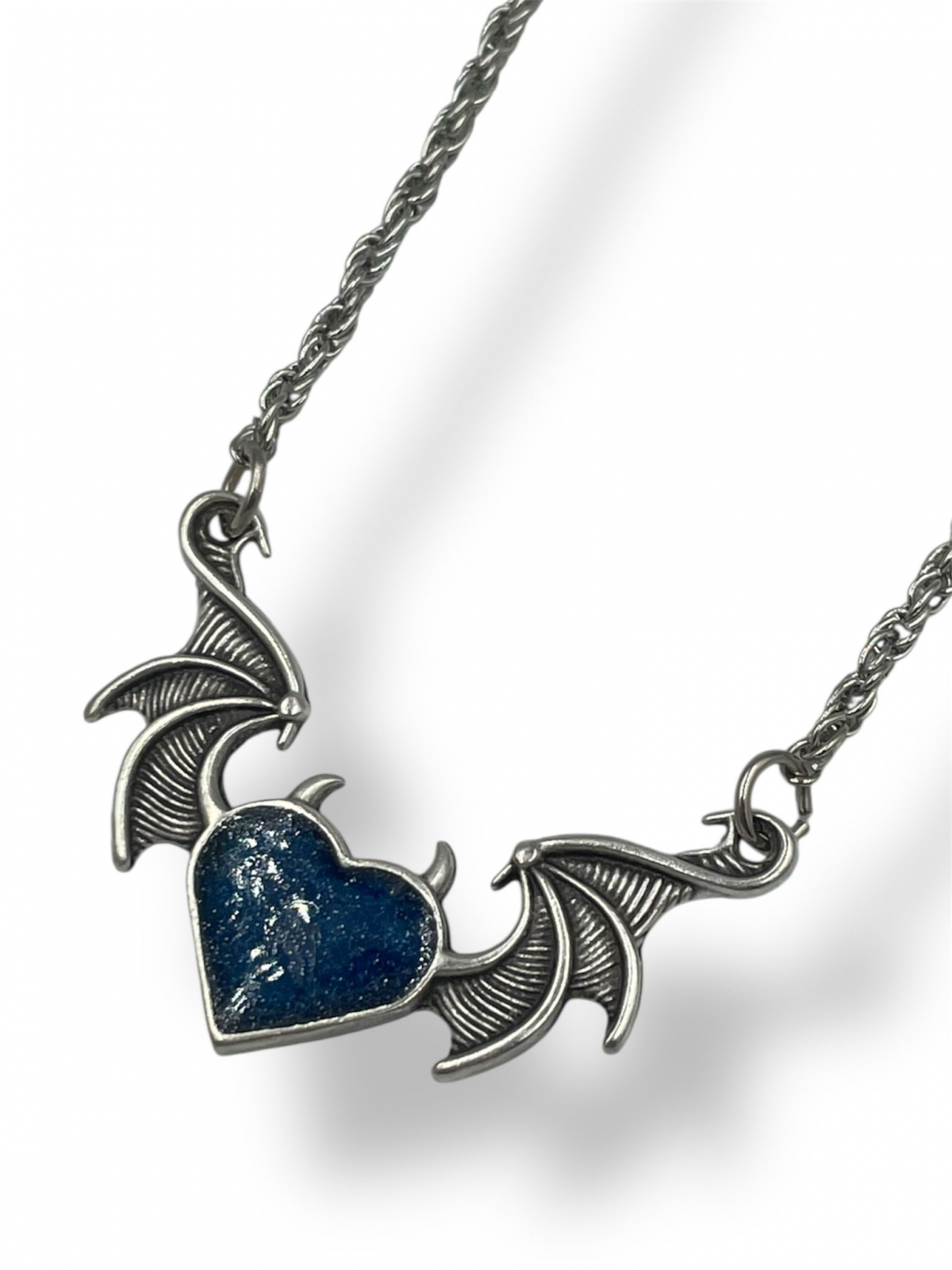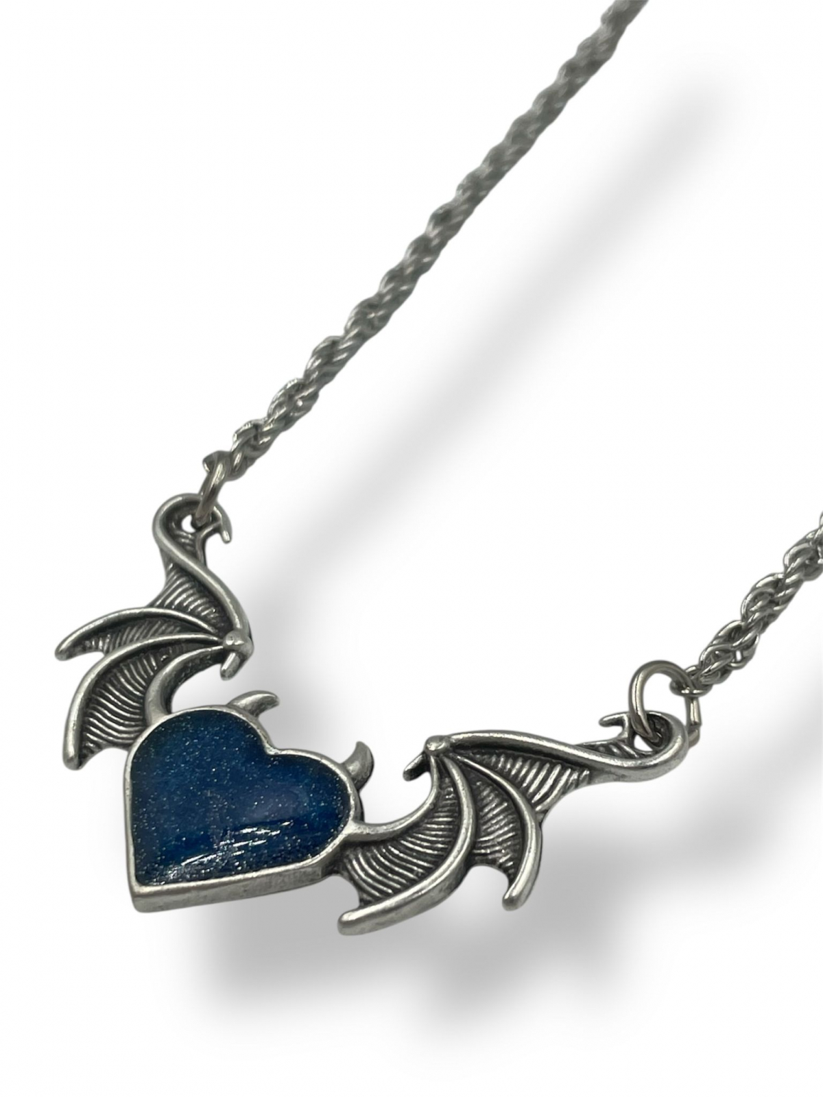 Lanțul Inimă cu aripi de dragon este un accesoriu cu accente gotice, creat pentru a adăuga o notă misterioasă și romantică oricărei ținute. Designul delicat, cu un pandantiv în formă de inimă înaripată, evocă eleganța întunecată și farmecul unui univers fantastic.