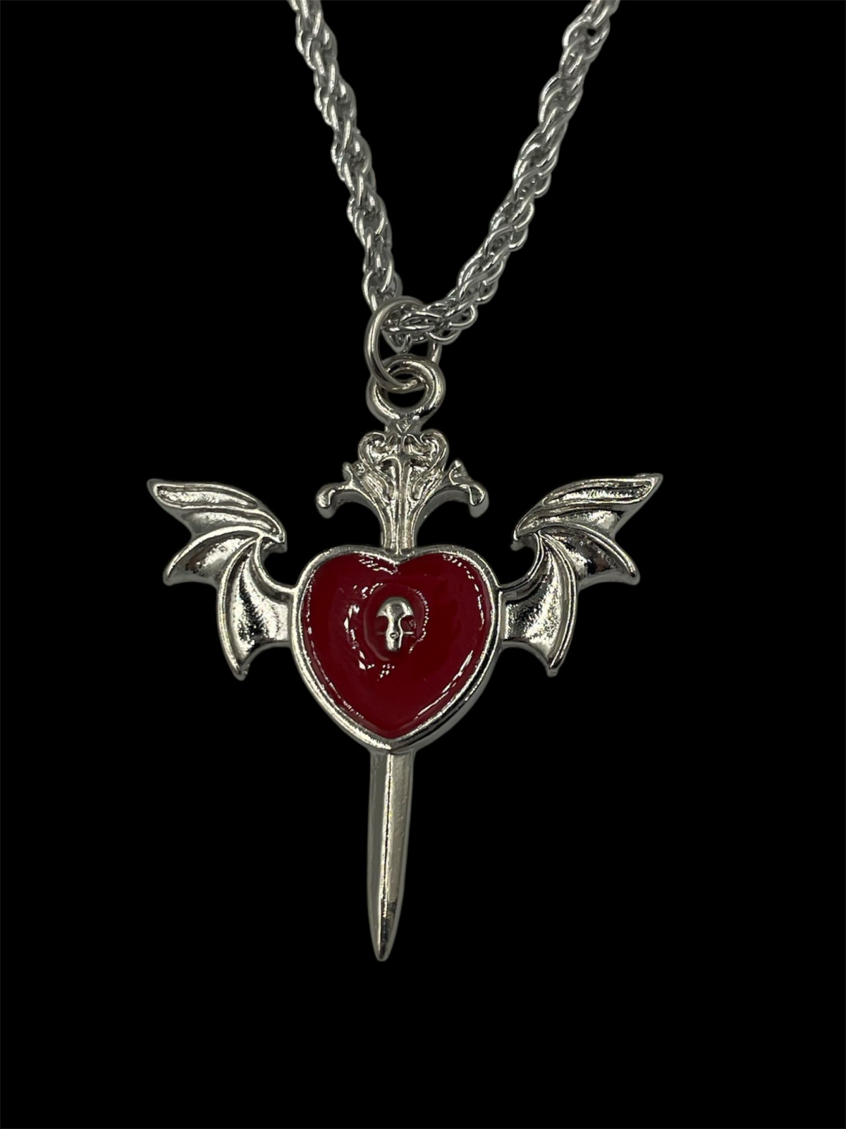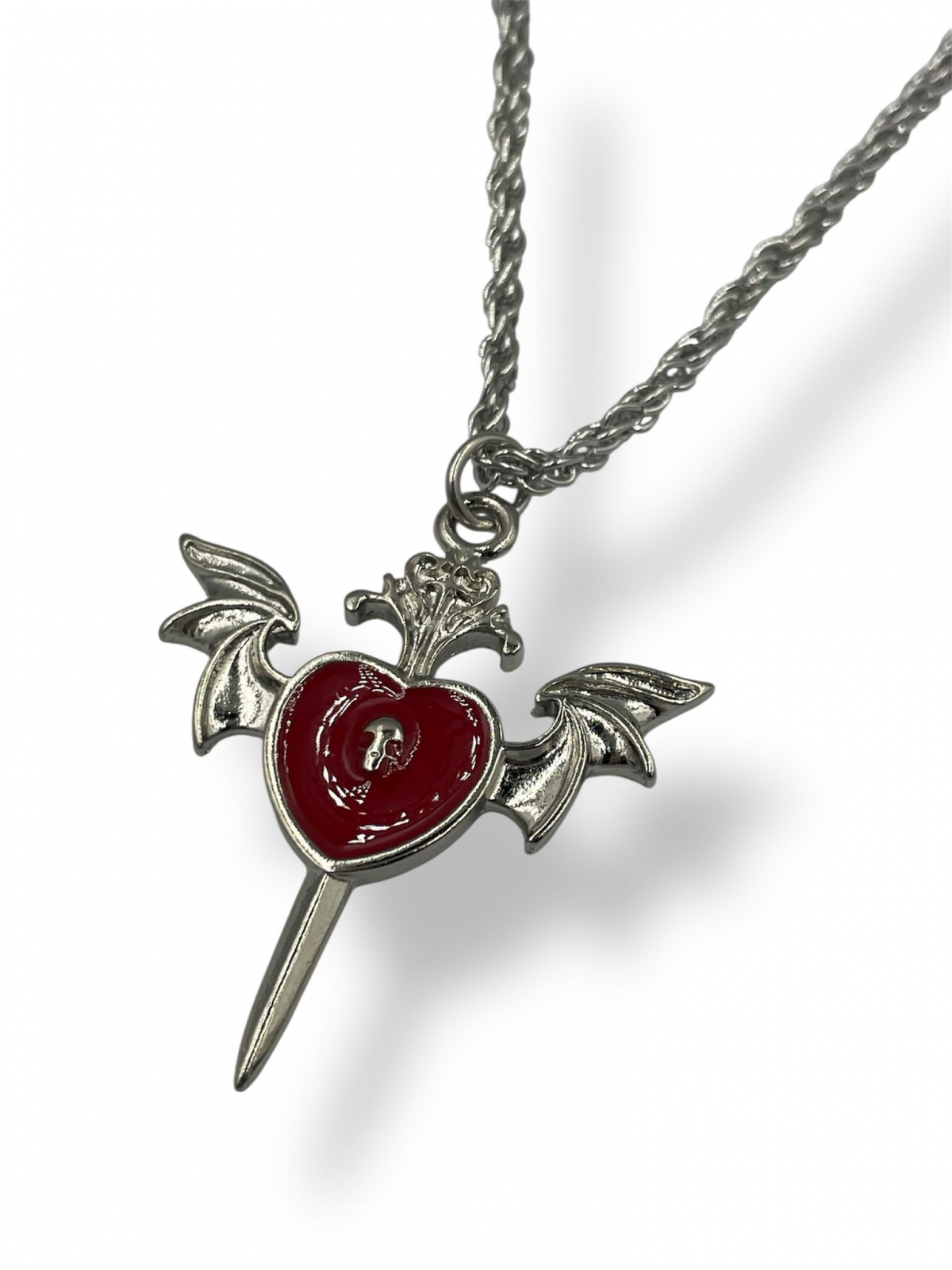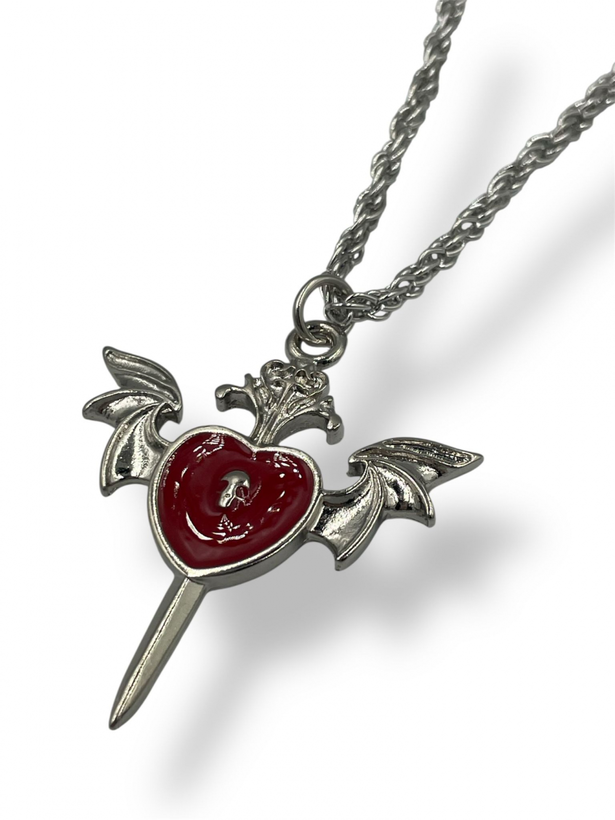 Pandantivul impresionant, de 4 x 4.5 cm, are forma unei inimi străpunse de sabie și înconjurate de aripi de dragon – un simbol al pasiunii, al luptei interioare și al puterii personale. Realizat cu atenție la detalii, acest colier adaugă un plus de stil și expresivitate look-ului tău.