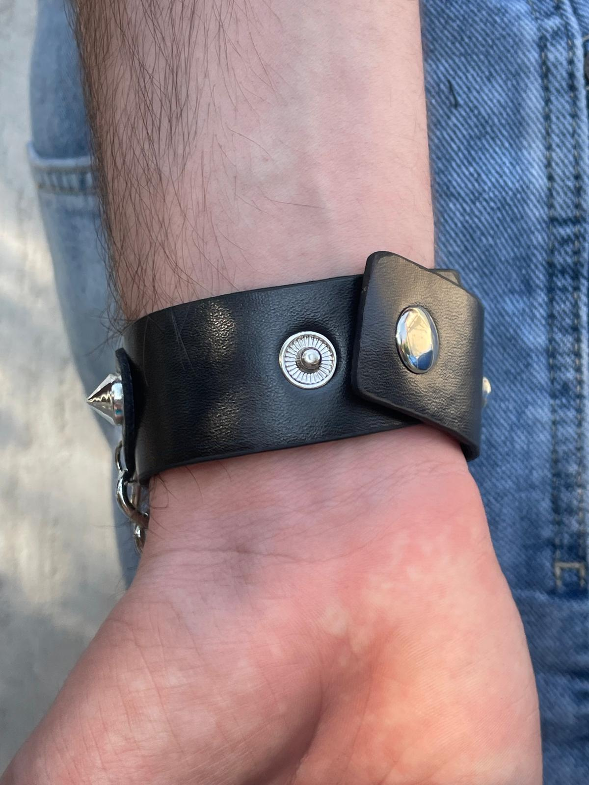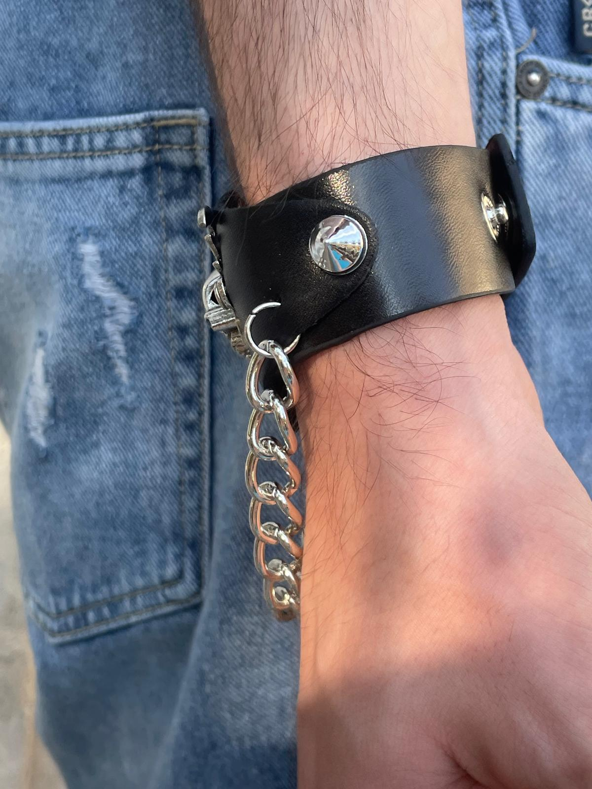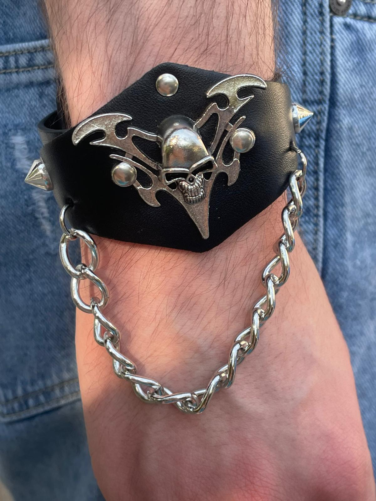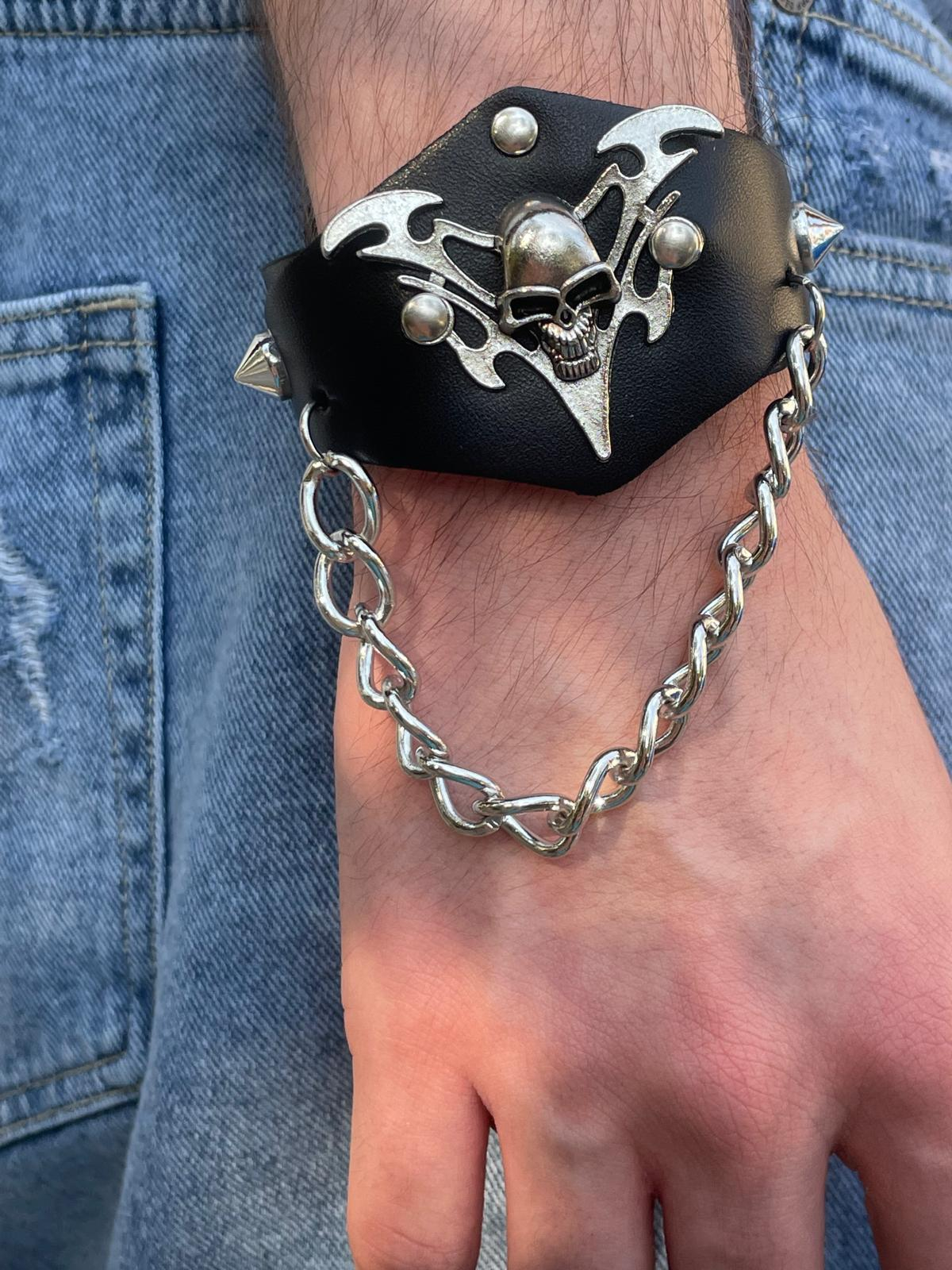 Fă-ți simțită prezența cu această brățară statement din piele ecologică, decorată cu un charm metalic de dimensiuni mari în formă de craniu și un lanț atârnat pentru un efect vizual puternic. Cu un look inspirat din stilul rock și biker, acest accesoriu impune atitudine și nonconformism.
